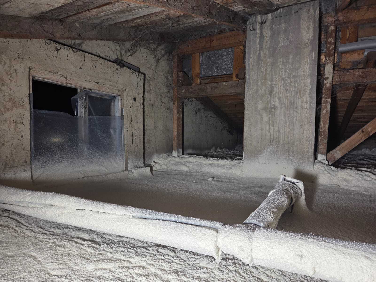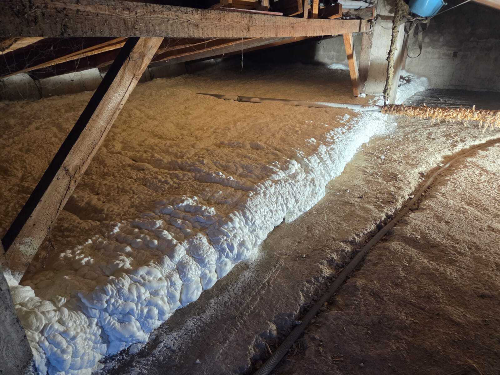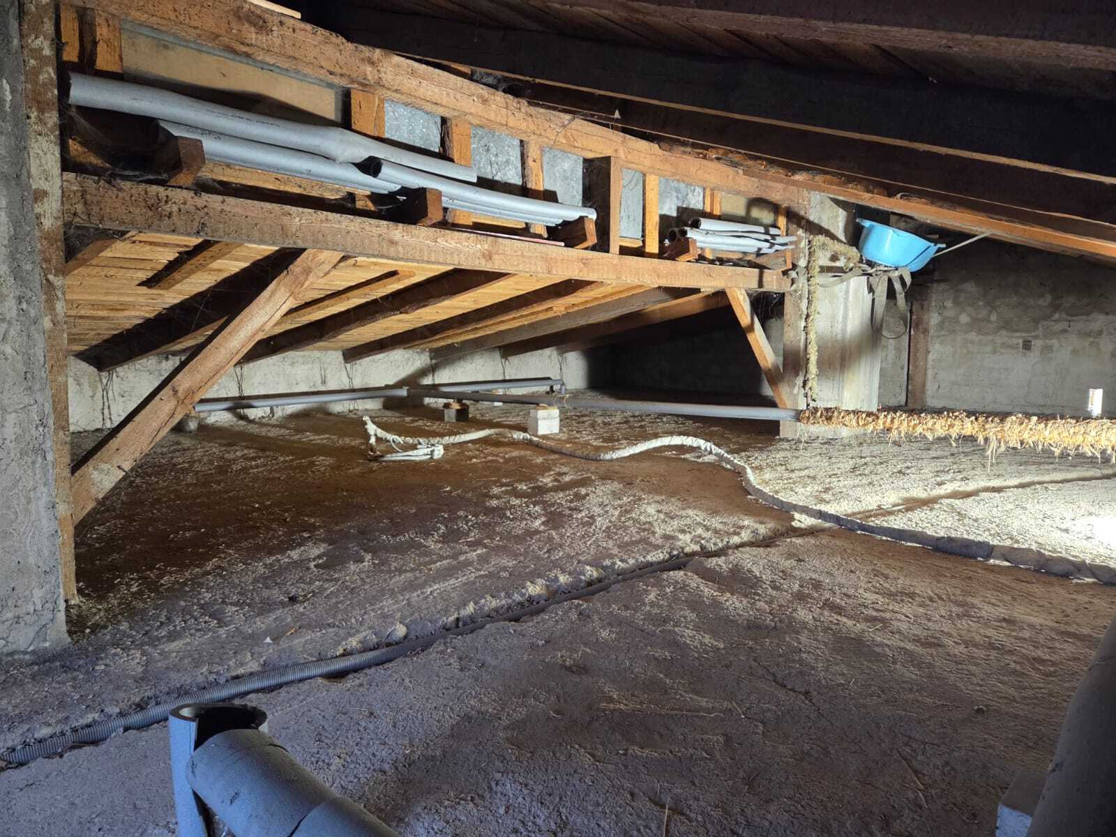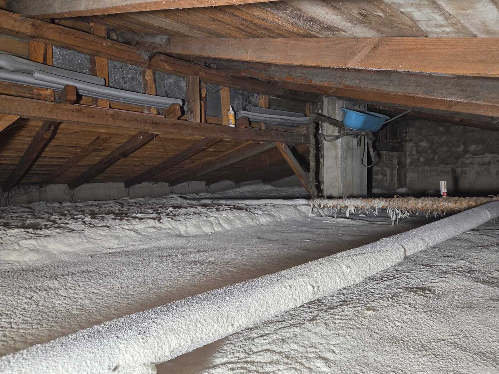 Poniżej prezentujemy zdjęcia dokumentujące przebieg prac. Najpierw można zobaczyć stan stropu przed ociepleniem, a następnie efekt po wykonaniu izolacji pianką PUR.