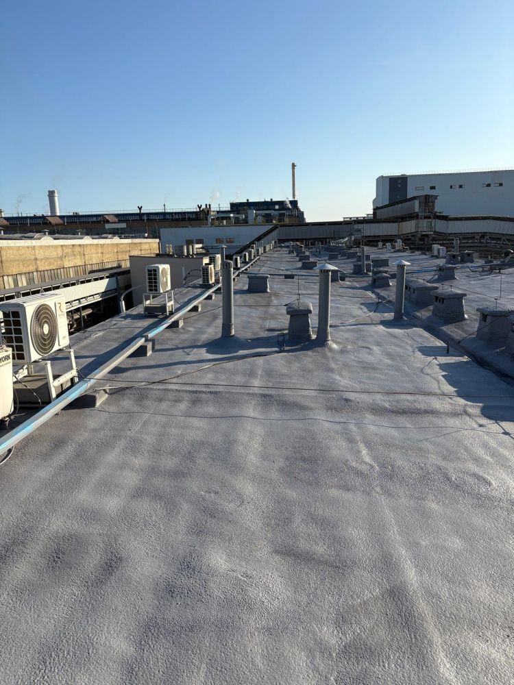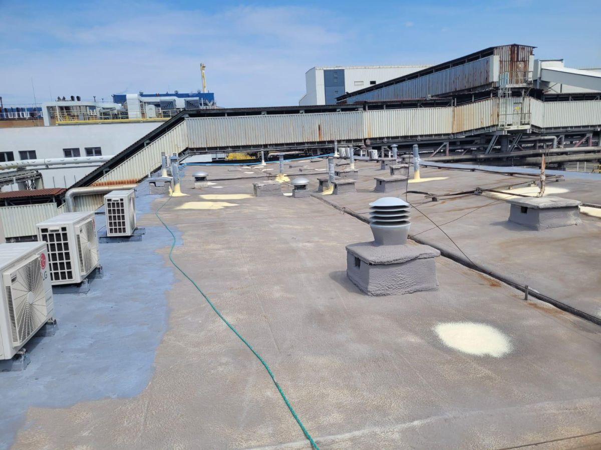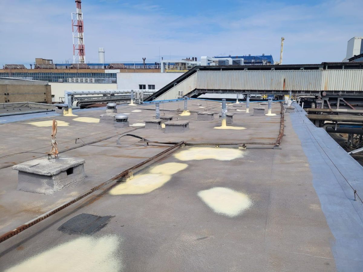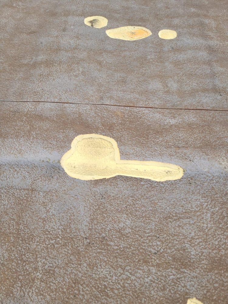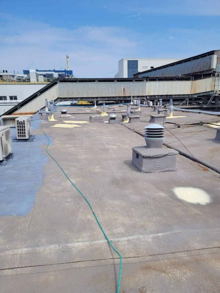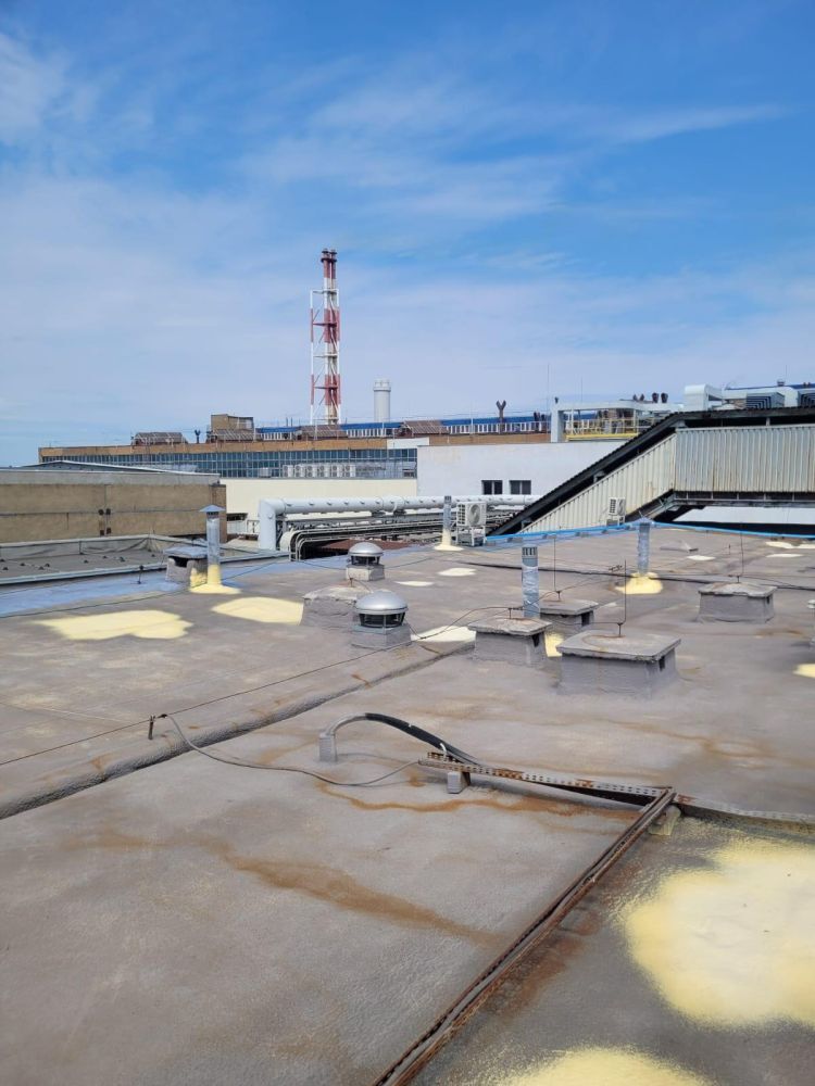 Naprawa punktowa starej izolacji piankowej na dachu płaskim. Ubytki wypełniliśmy pianą PUR. Całość została pomalowana i zabezpieczona.