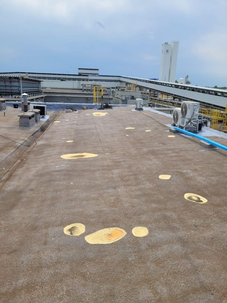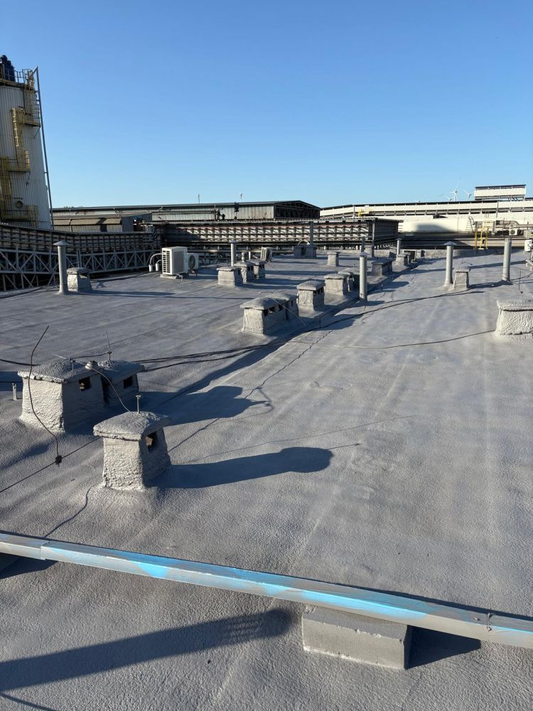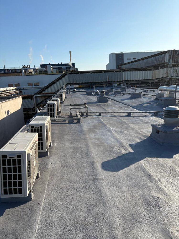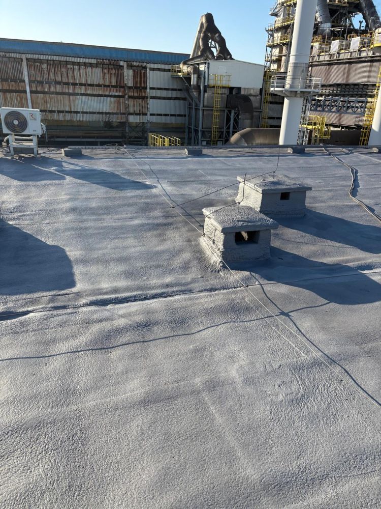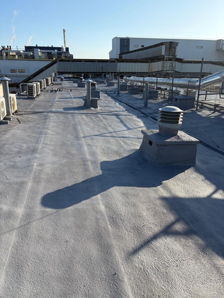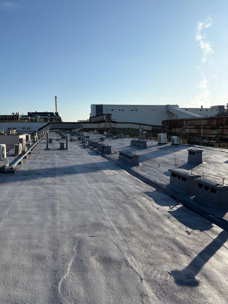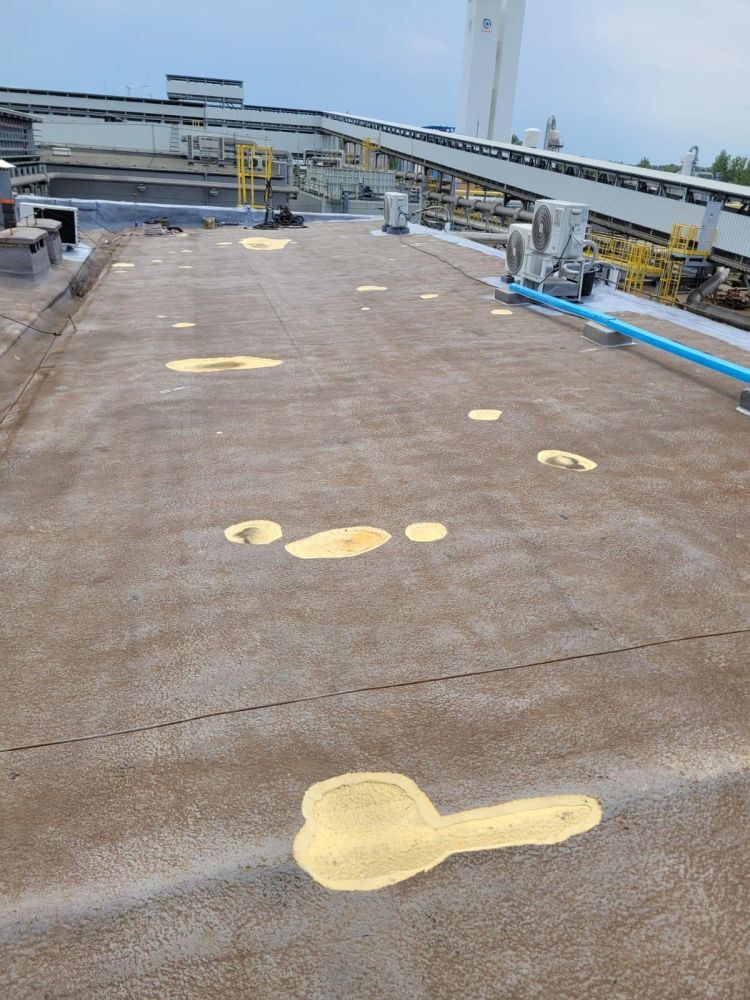 Naprawa punktowa starej izolacji piankowej na dachu płaskim. Ubytki wypełniliśmy pianą PUR. Całość została pomalowana i zabezpieczona.